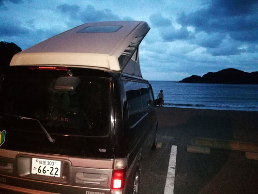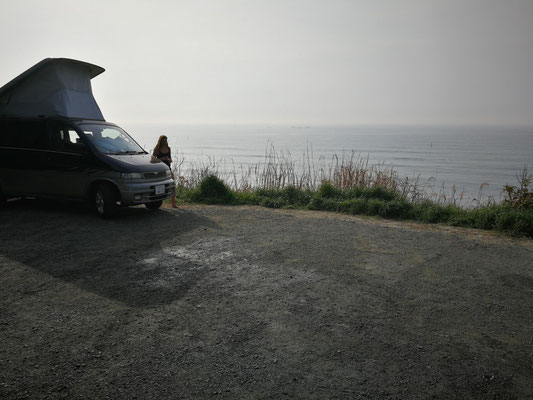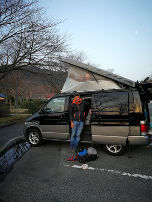 Der Campervan, der für fünf zugelassen ist, ein Mazda Bongo, ist äusserst, nennen wir es kompakt. Manchmal, in der Nacht, wenn es zu kalt ist um oben im ausgefahrenen Dach zu schlafen, finden wir es auch einfach eng. Gemietet haben wir den Camper bei der äusserst empfehlenswerten Firma japancampers.com. Bei Ihnen konnten wir auch bereits im Vorfeld die administrativ aufwendigen Übersetzungen der Führerscheine und andere Anliegen anbringen.