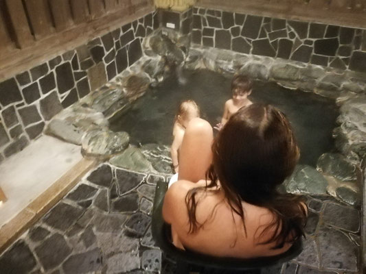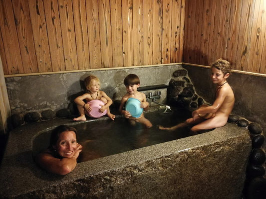 Ein paar coole Schlechtwetteroptionen haben wir schon entdeckt. So das private Onsen baden. Onsen sind natürliche heisse Quellen, die in Japan aufgrund der hohen seismographischen Aktivität äusserst häufig vorkommen. Im Onsen herrschen klare und strikte Regeln. So ist man nackt, ruhig und die Geschlechter getrennt. Da wir mit unserer lautstarken Jungschaft nicht einfach so einfahren wollen, haben wir uns alle zwei Tage ein privates Onsenbad gegönnt. Und Solstarmar finden auch das grossartig. Wie schon in Pai hat auch hier die heisse Quelle eine beruhigende Wirkung (und das ist einfach wertvoll! :)) und nebenbei können wir uns so auch regelmässig umfassend säubern! 😊